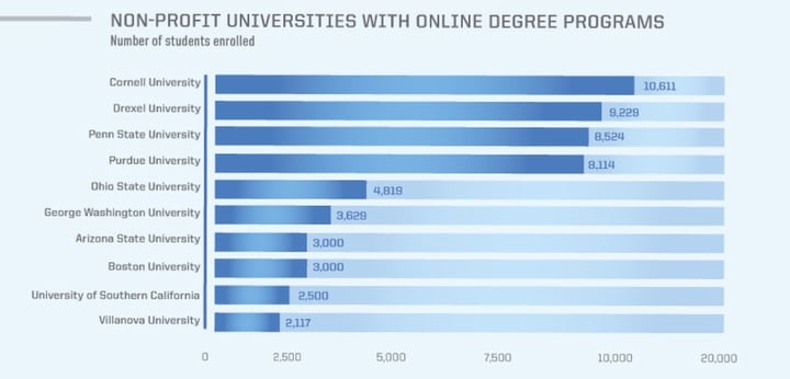 事实上这类在线教学我们现在也有接触。现在 96% 的美国大学至少开设一门在线公开课程,相信不少国内的朋友都看过耶鲁、哈佛等名校的课程。除此之外,美国一些学校还有非功利性在线学位授予项目,其中就有康奈尔以及宾夕法尼亚州立大学等名校。
