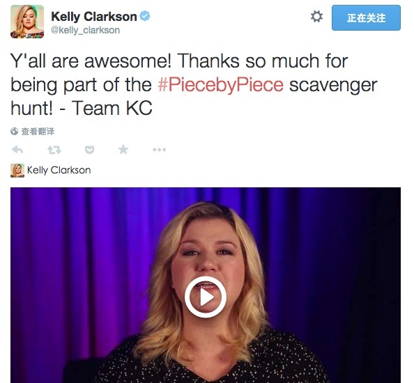 美国歌星 Kelly Clarkson 通过 Twitter 发起了一场在城市中寻找线索的活动,为新专辑《Piece By Piece》预热。所有相关推文通过标签 #piecebypiece 标记了起来。