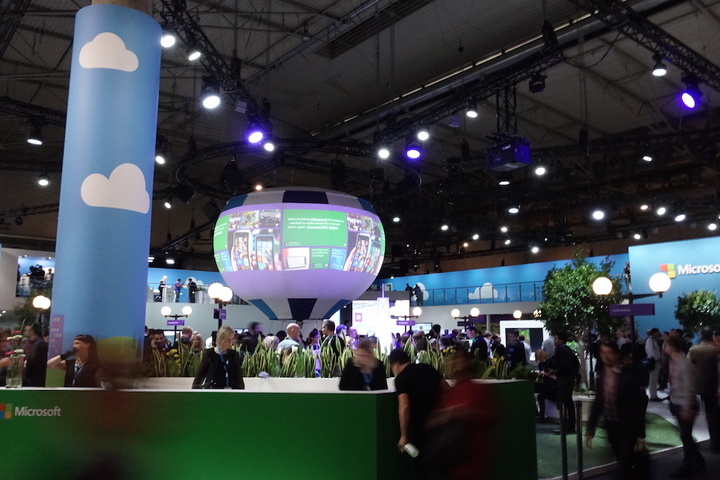 微软在 MWC 的展台给人感觉有种乡村的风格,有花草树木蓝天白云之类的视觉元素,还有路标、路灯。