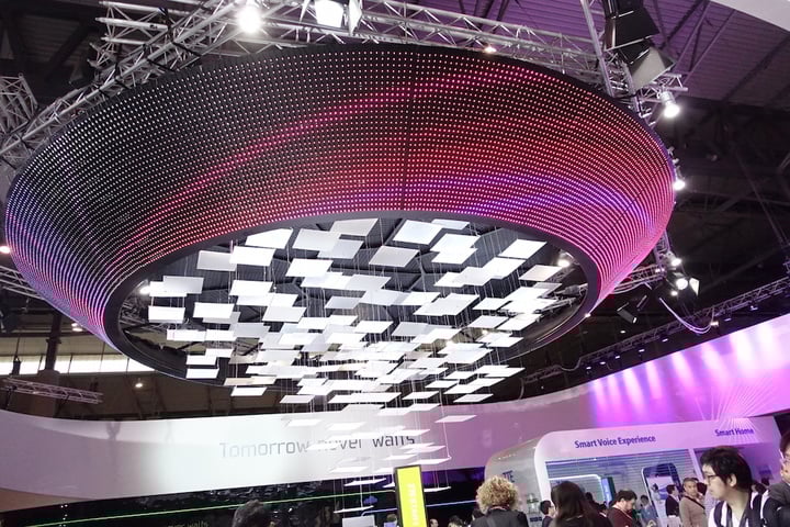 LG 展台的配色也主要是白灯和米黄色的墙,风格也偏简约,但由于展台比索尼小,所以还是给人感觉比较拥挤的。