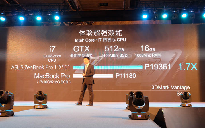 在发布会中,与 ZenBook UX501 做性能对比的是 MacBook Pro。