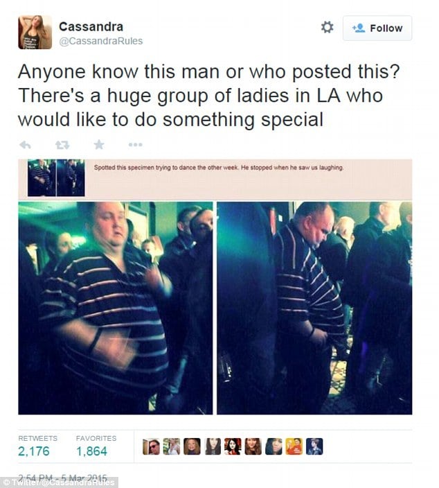 根据每日电讯报道,有人一名将舞厅里乐呵呵跳着舞的胖兄的照片匿名发到 Imgur 上,还配上了恶意的文字,“快看看这个胖子,居然来跳舞,他看到我们笑他时终于停了下来。”这组图片最后一张,可以看到胖兄因为遭到羞辱而难过低下头的申请。