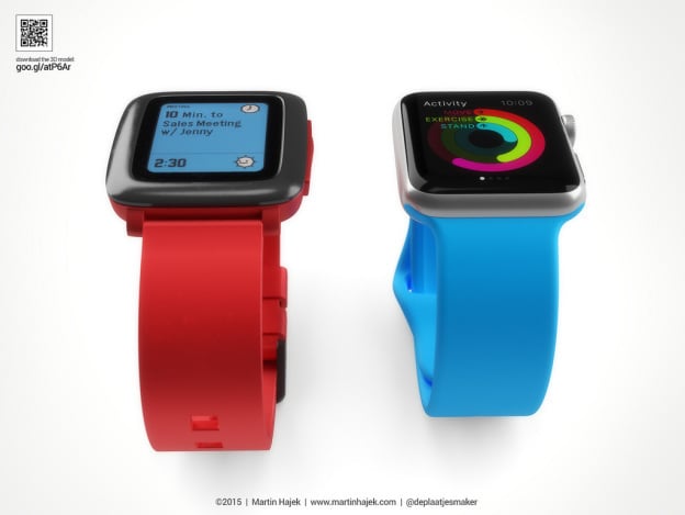 左为 Pebble Time,右为 Apple Watch(来源:BGR)
