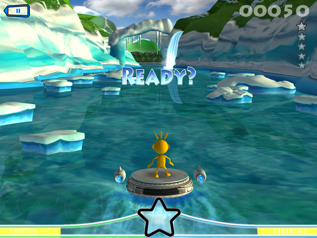 游戏的主角是一个黄色的外星小人,玩家驾驶着小木筏,奔驰在扭曲的水面上。游戏的任务很简单,击中水中不时窜出的蓝色小鱼,同时避开其他颜色的鱼和飞鸟。抓获的鱼越多,游戏难度越高。