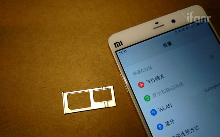 小米 Note 支持双卡双 4G,5 模 15 频。两个卡槽一个是 Micro-SIM,一个是 Nano-SIM 卡,两者完全可以混用,不区分制式和运营商,即便只安装一张 SIM 卡,右上角的只显示一个对应的网络标志,不会像早前的双卡双待手机一样,把另外一个 SIM 信号图标上打上一个叉号。这些都是值得加分的细节。