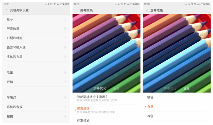 平装版小米 Note 的屏幕保持了和米 4 相同的分辨率,都是 1920×1080,95% 的 NTSC 色域覆盖,386 PPI 的像素密度。在开启“智能场景环境适应”时,屏幕显示鲜艳锐利,即便是强光下也有比较好的可视性,在这一模式下会自动开启小米所说的“阳光屏”功能,有点像在拍照时使用 HDR,提高画面暗部亮度和对比度,同时控制亮处的亮度,增加对比度,达到既省电又增强显示的效果。切换回标准模式又是另外一种观感,清淡很多,但颜色不够通透,总感觉像是轻度雾霾之下的北京城。屏幕增强模式下,发色倾向和智能场景模式下接近,比较鲜艳,但也达不到 AMOLED 屏幕的饱和程度。整体的屏幕设置还是有些繁琐,无形中增加了用户的一些学习成本。