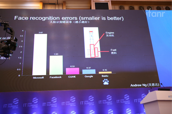 比如语音识别率,错误率最高的是苹果,超过 25%,紧随其后的是微软,百度的错误率只有 10% 左右。吴恩达说,语音识别正确率达到 99%,将彻底改变智能手机。