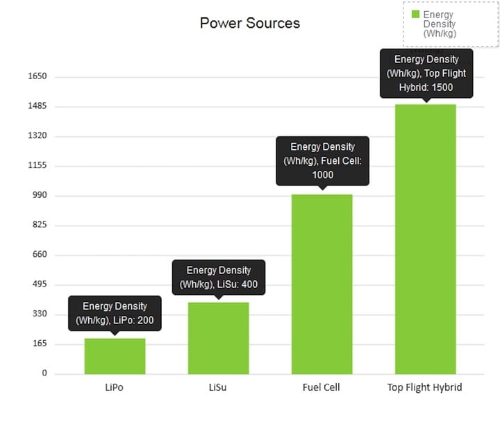 Draper 实验室和 MIT 的研究人员成立的 Top Flight 公司研制出了一种六旋翼的混合动力无人机。只需要 1 加仑汽油,便可以飞行两个半小时、约 160 公里的距离,最高负重达 20 磅(约 9 公斤)。这一飞行时间是无线电控制、汽油发动的小型直升机的两倍,比目前市场上最流行的四旋翼无人机多出数倍。