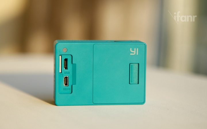 背后有两个可开启的后盖,其中一个打开可以看到 USB、HDMI 和 TF (micro SD)卡插槽,最大支持 64GB 内存卡;另外一个是电池仓,采用了可拆卸的电池设计,容量为 1010mAH,电池仓盖较厚,在体积上似乎还有可压缩的空间。底部是通用 1/4 螺纹接口,可以外接脚架或者是八爪鱼小型三脚架。