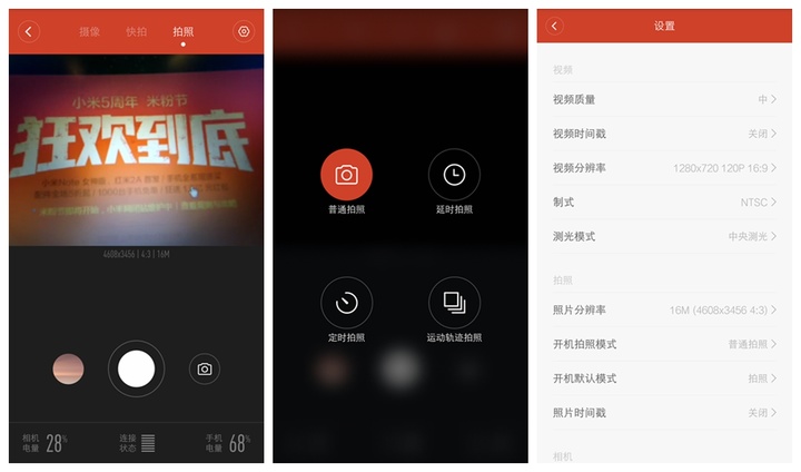 手机的 app 界面和小米自带的相机应用类似,有正常拍摄、延时拍照、运动轨迹拍照、定时拍照四个选项,还可以选择摄像、快拍(640×480 30fps 的低画质)。在 1280×720 分辨率下,小蚁运动相机最高支持 120fps 的视频拍摄,这对于捕捉运动场景还是很有用的。右上角有设置选项,可以调整摄像分辨率、测光模式、指示灯控制,以及升级固件等选项。