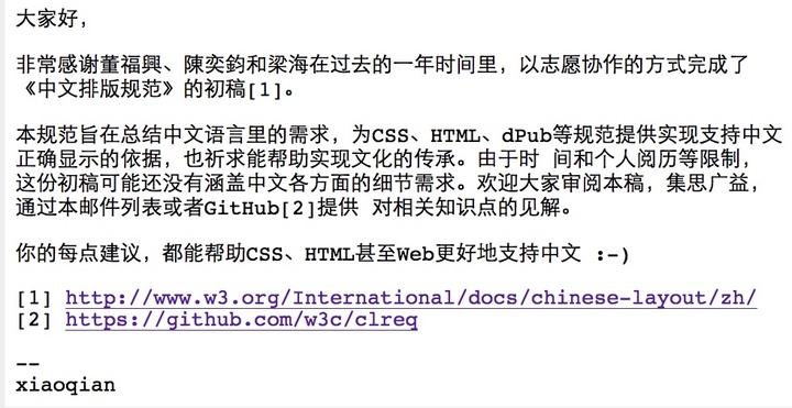 W3C 的《中文排版规范》对于中文网络世界有着重要的意义。它可为将来的创业者、产品开发人员提供一份权威性的参考性文件,保证中文网页、中文 App 基本的美感。