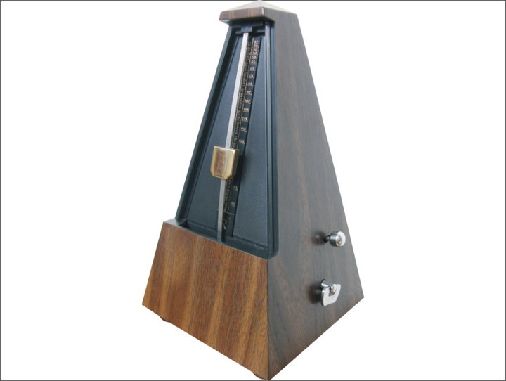 目前,使用最普遍的机械节拍器是 1816 年由奥地利人 J.N.梅尔策尔发明的。这种节拍器呈金字塔形,内部为时钟结构,有齿轮及发条,带动一摆杆,摆杆每次摆动结束时发出尖锐的“滴哒”声,滴哒声的速度可根据刻在摆杆上的游尺刻度上下移动摆锤,进行调整。