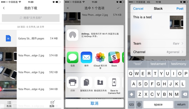 - 和上面类似的场景,但是需要把文件发送到社交网络,或者是工作网络。不过由于目前刚刚升级 iOS 8.3,微信、QQ 的分享插件似乎出现不再生效,暂时没有办法直接把照片和视频文件分享到社交网络,可能需要等到微信、QQ 等客户端更新之后才能够使用。但是已经可以将照片分享至 Slack、Evernote、Trello 等协作工具。