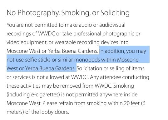 自拍杆从去年下半年到现在,在全球各国迅速走红。自拍杆的加速普及,也给不少活动举办方造成了困扰。要知道,苹果向来对大会效果的要求都是非常苛刻的,他们希望到场观众都能欣赏到最佳效果。苹果公司担心使用自拍杆的人会打扰到其他观众,于是干脆在 WWDC15 官网明文写道: