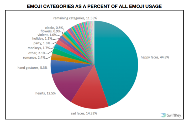 - 在所有的 800 多个 Emoji 表情符号中,过去的一年里,大家使用得最多的是“微笑脸(happy faces)” 占到了 44.8%;其次是 “哭丧脸(sad faces)” 占 14.33%。看来还是积极的情绪占到了主流嘛。