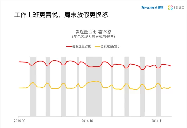 - 和想象的情况不同,工作日的消极情绪表情发送量小于周末。于是不负责任的推测又来了,“各位网友在工作日压抑着怒火,表现的更为淡定开心,到了节假日就做回自己,尽情释放怒火…”