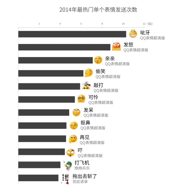 - 单个表情方面,“呲牙”以超过十亿次的发送频率拔得头筹。个人最爱的“抠鼻”竟然只排在第七……