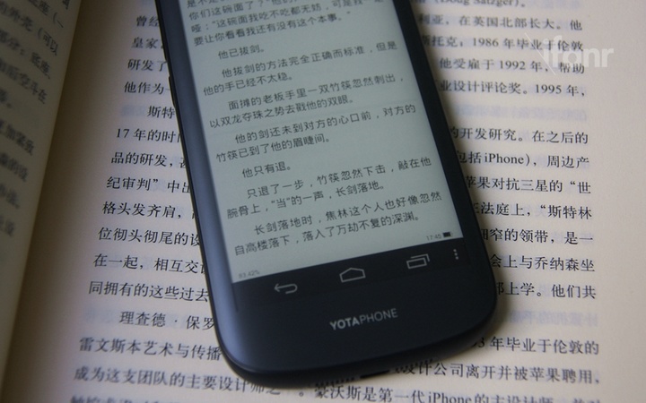 不过,后面的电子墨水屏幕并没有背光,这有可能是出于整机厚度的考量。但是 YotaPhone 2 这块电子墨水屏的刷新率等各项指标上和亚马逊 Kindle 电子书相比还是存在明显的差距,屏幕会有严重的残影,显示画面也比较暗,就像是老旧报纸似的。界面来回滑动几次,或者是多打开几个网页之后,屏幕就变成了大花脸,甚至会影响到文字内容的阅读。