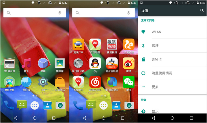 720P 屏幕已经逐渐被各大主流品牌抛弃了,但 Moto G 的这块 IPS 屏幕并没有想象中落伍,整块显示屏在色彩还原上做的不错,搭配几近原生的 Android 5.0,整体也算赏心悦目。相比 Moto X AMOLED 屏幕的高对比度,Moto G 并没有光彩夺目的表现,整体颜色偏冷。