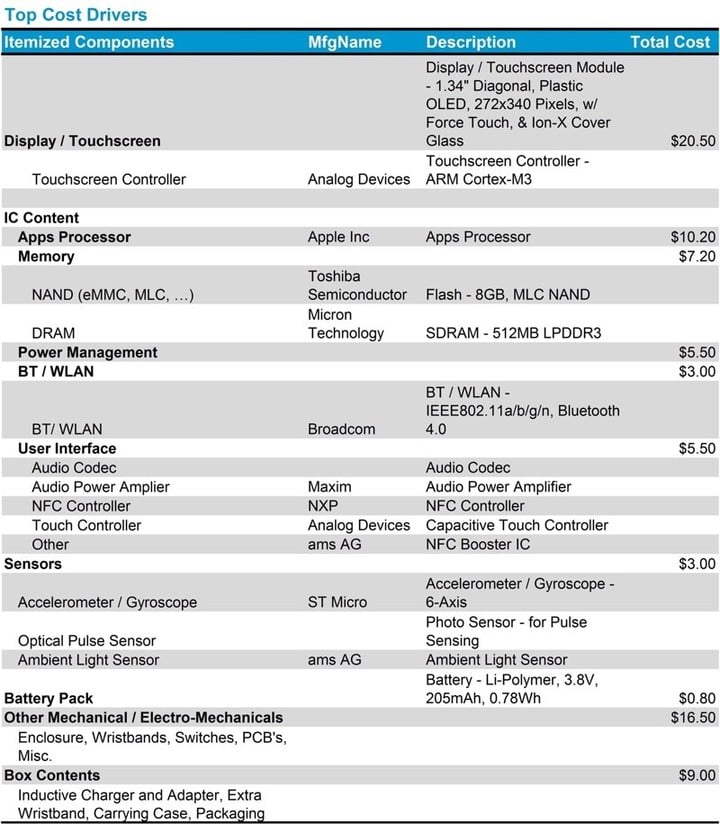 如果你想知道 Apple Watch 详细的物料成本,可以看以下的清单: