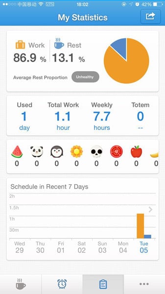 而点击那个像小本子的图标,则是最近 7 天的休息和工作的数据,通过这些数据,App 会判断使用者的生活习惯是否健康。请忽视图中那个“unhealthy”吧……这里还可以看到完成之前既定的休息任务所获得的徽章奖励。这些历史数据都是可以导入和分享的。