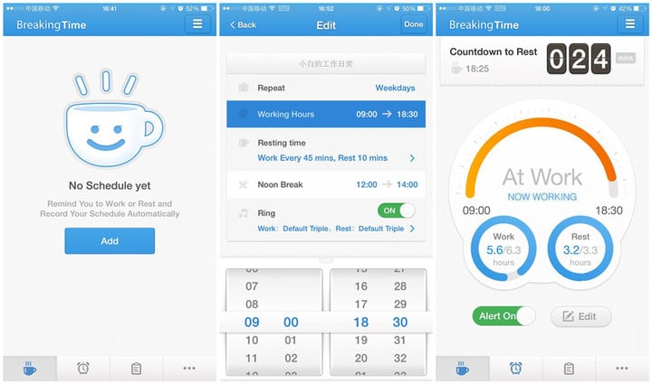 应用市场里面的作息或者日程安排应用数量不少,但绝大多数都强调了“作”而忽视了“息”,这让人长时间地保持紧张的精神状态,反而更加容易疲劳。昨天刚上线的 Breaking Time 也是一款标记作息时间的 App,但这款 App 在提醒使用者注意工作时间的同时,更强化了“休息”时间这一概念,让人能实现工作与休息的平衡。