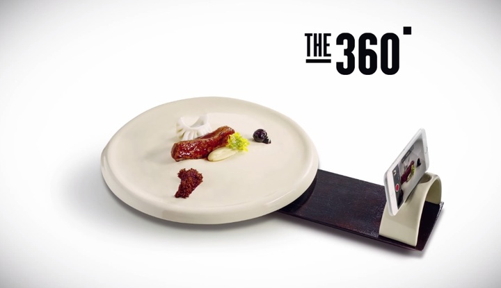 The 360 ° 则是一款可以旋转的餐具。从上图可以看到盘子的一侧同样有防止手机的装置,而左边的那个圆盘是可以转动的。食客们在拍摄时可以随心转动,找到最适合的角度。