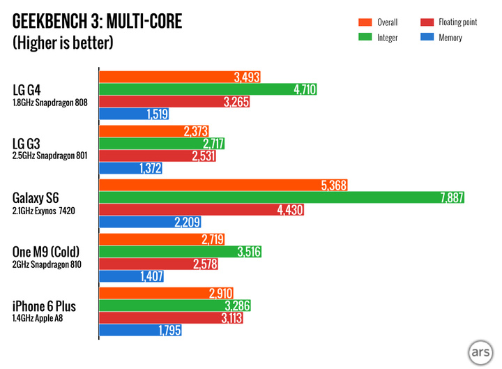 虽然在处理器主频、GPU 和 RAM 上,808 和 810 还是存在着一定的差距,但在实际的测试中,由于前面讲到的降频现象,在 Ars Technica 的测试中,808 的成绩在某些项目上甚至比 810 要高一些,比如 Geekbench 3 的多核心测试,LG G4 3493 的总分高于 HTC One M9 的 2719。当然,这一成绩在三星 Exynos 7420 面前可以说是惨遭碾压。