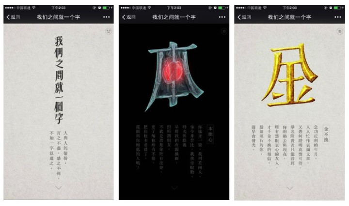 1、大众点评的《我们之间就一个字》,主打文字方式的阅读表现。采用灰白、黑色背景,以差异化的音效、动效营造出不同的故事场景氛围,利用文字巧妙勾勒出不同主题的文字故事,通篇无人物角色却处处引发用户自身联想,建立与用户的联结同时触动用户 , 帮助用户创造出属于自己的鲜活故事。