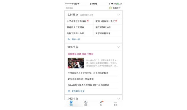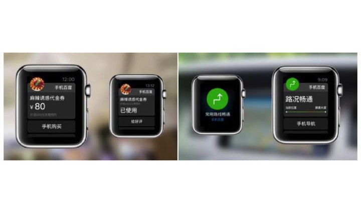 2. 在最新发布的 iwatch 应用中,卡片化的设计应用也很频繁,在下面这个手机百度的界面中卡片化的设计能够把团购的重要信息一览无遗的展现出来。手机百度中地理位置服务也采用了卡片化的设计,不同的卡片组合及内容展现能够突出服务。