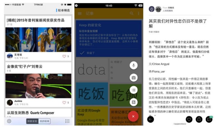 根据情况将 “功能” 或 “导航” 等原本在顶部导航栏的按钮下移到界面底部,确保用户在单手操作时可以在易于操控的区域内,缩短操作路径,降低点击成本。轻单、KEEP、MONO 等内容类的应用将主要功能按键设计在屏幕底端,不仅提升了操作的可触达性,同时突出了内容,改善了阅读浏览体验。