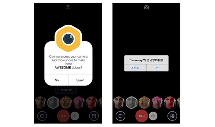1. Looksery 产品在调用 iOS 系统相机请求之前,通过情感化图标和询问式语言,向用户传达了调起相机的作用,让用户了解调用目的,使授权转化率得到很大的提高。