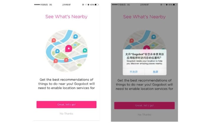 2. Gogobot 产品在获取用户地理位置之前,描述对应使用场景及其必要性,满足用户对开放此权限的心理预期,提升授权转化率。