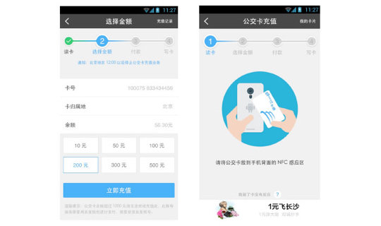 2. 百度钱包联合国内公交系统利用 NFC、蓝牙等技术向用户推出手机公交卡充值业务,用户只需将公交一卡通置于带有 NFC 或蓝牙功能的手机上即可轻松完成充值。另外还能读取用户的卡内余额、交易记录等信息,免去了用户线下排队的烦恼。