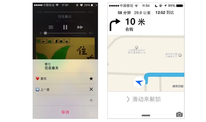 2. ios 系统的锁屏界面,会根据用户的地理位置以及周边信息推荐可能需要的应用,例如用户在招商银行附近打开锁屏界面,屏幕右下角会出现招商银行应用的快捷入口。