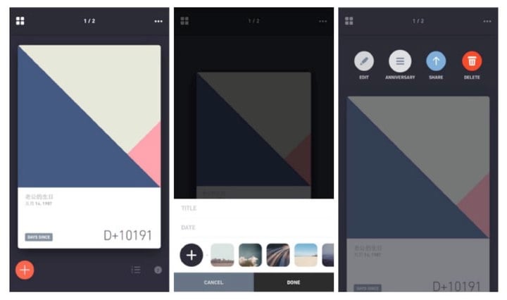 2. UniqDay 做为 “小而美” 的功能型应用,在产品设计之初会更多考虑到用户的学习成本和接受度。UniqDay 就是通过轻量化的结构设计让用户在第一次使用的时候就记住它。对于倒数日的添加、编辑设计,UniqDay 都巧妙的通过弹层或平移方式帮助用户理解当前所处的位置,使核心模块稳定在用户的视线内,减少页面级的跳转。