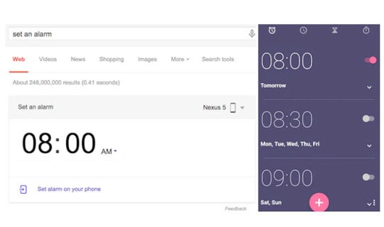 2. 从 google 搜索网页端给手机(安卓)设定闹钟(目前仅限美国):在网页端搜索框输入 “set an alarm” 或 “set an alarm for 11:00”, 发送到选定设备。设定好的闹钟将直接出现在状态栏里,实现从网页到手机的任务传递。
