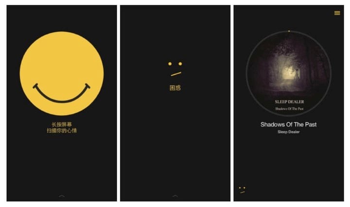 3. emo 突破了传统的框架布局,极端强化了核心功能。这种沉浸式体验设计是结构轻量化、扁平化极端的表现,使得用户更专注于根据心情听歌的功能与呈现内容本身,而不被其他的操作路径打断。