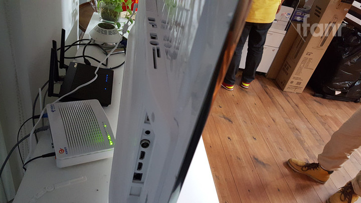 我拆开包装看到这个电视本体的时候,有点吃惊,深邃的屏幕充满了神秘,而银色的底边和底座,又让整个电视的看起来多了一丝生气,不至于呆板。侧面的惊鸿一瞥,让人印象深刻。官方数据是最薄处只有 7.9 毫米。出于好奇,我把我的 7.9 毫米厚的手机拿去比了比。果然,不差毫厘。据官方的资料,这么薄的厚度都得益于三层一体化模组技术把背光与液晶玻璃结合,最大限度的降低了电视的厚度。而且,其电视的后面采用了少见的白色设计,电视的所有接口都位于其右侧。