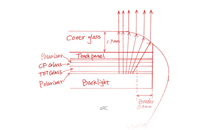 根据 nubia 在官网刊出的信息显示,nubia 发明了一项名为 aRC(arc Refractive Conduction,弧面折射传导)的技术,是将屏幕的显示内容折射到玻璃面板的边缘,这样在视觉上,边缘部分承担起了显示屏的作用,遮盖住了屏幕的黑边。这对玻璃的折射率、透光性都有着一定的要求。
