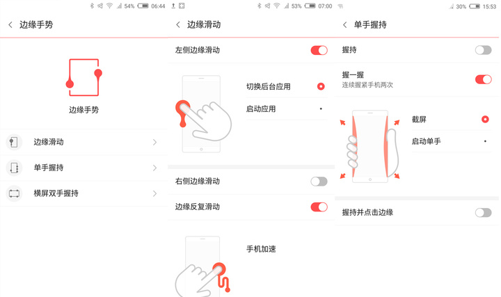 针对这种设计,nubia Z9 内置了一个单独的“边缘手势”app,里面详细罗列了 nubia 所开发出的三种边缘操控手势,分别是边缘滑动、单手握持、横屏双手握持。