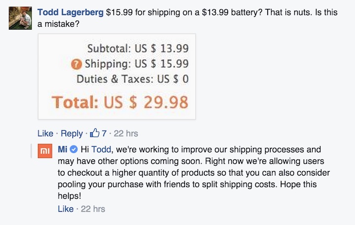 小米的电商网站在美上线第一天,官方 Facebook 页面随即遭到了吐槽:小米移动电源仅售 13.99 美元,而快递费要 15.99 美元。而小米的回应相当官方:我们正在提升快递服务体验,在未来将有更多物流选择。