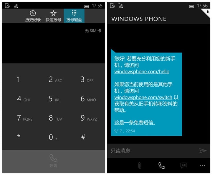 (左为拨号界面,这里有个问题得指出来,在切换拨号键盘和快速拨号时,只能点击上方按钮,相比 WP 8.1 的滑动,可以说是一种退步;右为短信界面)