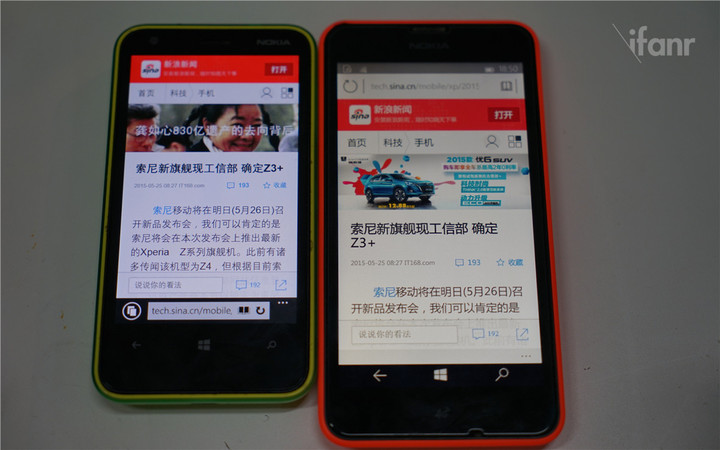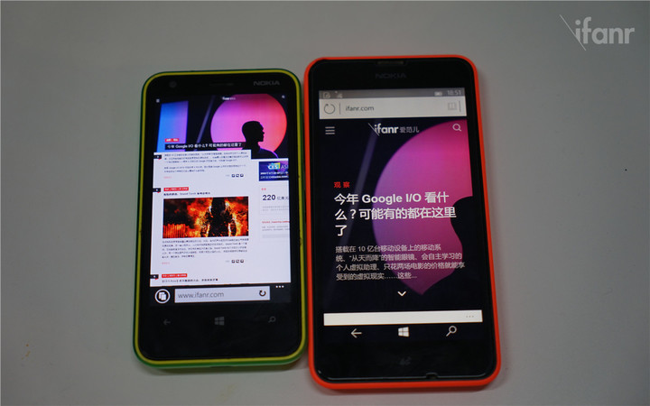 (左为 Lumia 620 ,系统为 WP 8.1 ,浏览器为 IE;右为 Lumia 638,系统为 Win 10 Mobile ,浏览器为 Project Spartan。两机同时打开我司主站的情况,IE 为 PC 版网页,Spartan 为 手机触屏版界面; Lumia 638 明显更快,当然这和 Lumia 638 硬件配置更高有一定的关系)