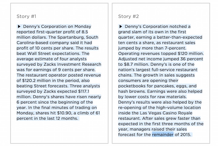 比赛规则是:Horsley 和 WordSmith 一起等 Denny’s 餐饮公司出财报,两“人”同时开写一篇短报道,比的主要是速度和质量。