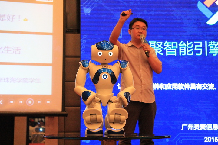 在现场,灵聚智能在法国 Aldebaran 公司所推出的仿人机器人 Nao 接入了自己的智能助理,让它可以识别中文语义,并作出回应。——在现场演示当中,灵聚智能引擎做到自然的语音交互,比如说中间插话,可以直接打断当前的任务流,然后直接切换到下一个动作。