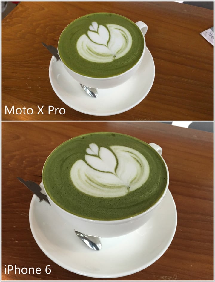 我用 moto x pro 和 iPhone6 的拍摄效果进行对比,第一组是“在光线不好的下午 3 点的一杯抹茶”,第二组是“一朵在弱光环境的假红玫瑰”,moto x pro 画面整体亮度要比 iPhone 6 更高,但是白平衡有点飘忽。
