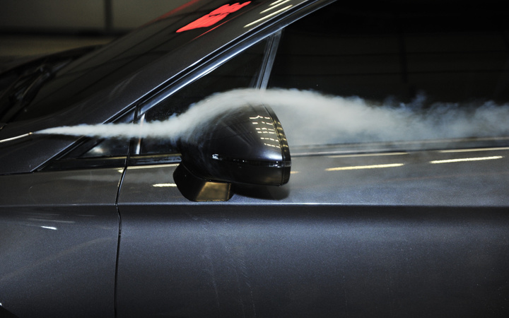 开头所说的 0.27,就是威朗的风阻系数,这一系数甚至比奥迪刚刚发布的 R8 e-tron piloted driving 自动驾驶汽车还要低 0.01,为了达到这一数值,别克的空气动力学工程师历时两年,进行了 500 次的优化以及超过 200 小时的风洞试验(下图白色烟雾为烟枪喷出,做指示气流之用)。