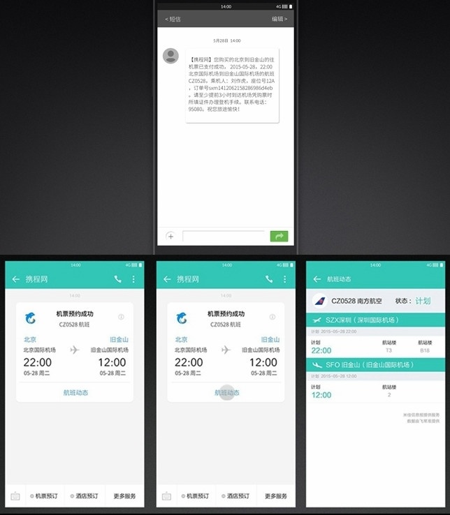 鉴于短信已从点对点的沟通工具变成信息接收工具,氢 OS 还将卡片运用到短信中,设计出“卡片式短信”。“卡片式短信”砍掉了多余的文字,将信息整理成简单明了的卡片,并且和移动互联网服务实现连接。假如你成功订购了一张机票,在氢 OS 上收到的短信将不再是大段文字,而是以卡片式展现出来的简洁信息,点击后还可以实施查看详细的航班动态。