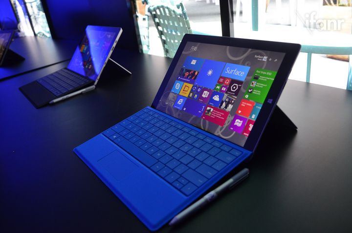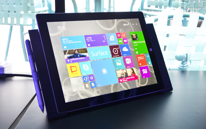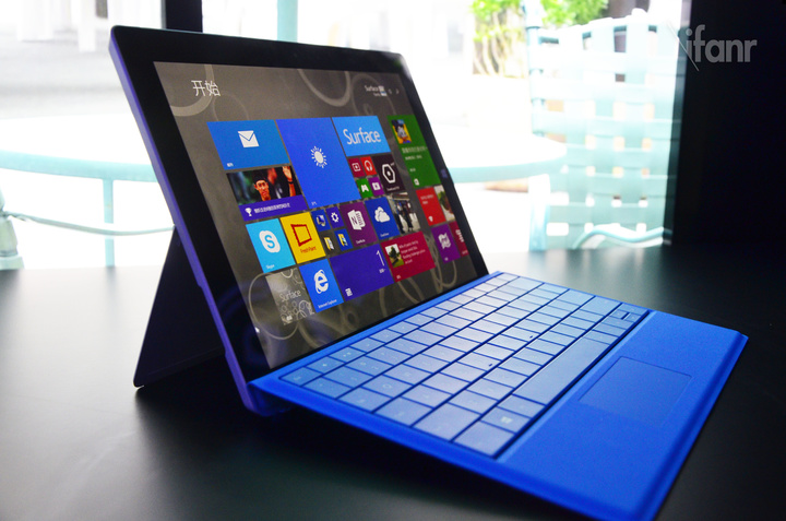 现场展示的 Surface 3 有三件配件,分别是 Typer Cover 键盘盖、触控笔和扩展坞,都需要额外购买。